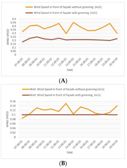 As seen in Figure 9, the LW shielded the wind from the façade during a winter day, contrasting with the façade without greening. When tested on the southeast façade during the cold day, the wind speed fluctuated by 0.7 to 0.24 m/s, and the most considerable dropping variation was 0.24 m/ss, while it was reported to be 0.05 m/s on the northwest façade. On the test day, the southerly wind was the predominant direction. Hence, the southeast façade had a more substantial wind barrier effect than the façade facing the northwest. A GW minimizes the heat transfer between indoors and outdoors [80]. Perez et al. [81] reported that blocking the wind enhances a building’s energy efficiency. The thermal losses from the building envelope are an indication of the value of the overall energy balance and depend significantly on wind convection [82]. Both tested façades effectively blocked the wind, contributing to building energy savings.
