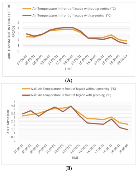 The air temperature in front of the southeast façade covered with plants between 7 a.m. and 3 p.m. was at its highest point of 0.31 °C on a cold winter day. After 3 p.m., the situation was reversed, and the air temperature in front of the southeast façade without greening showed the upper maximum difference between 0.35 °C and 0.48 °C. During the day, the LW reported lower air temperatures in front of the façade, which ranged from 0.00 to 0.71 °C. The air temperature differences in front of the northwest façade with greening reached their maximum amount at 7 p.m. (Figure 10).
