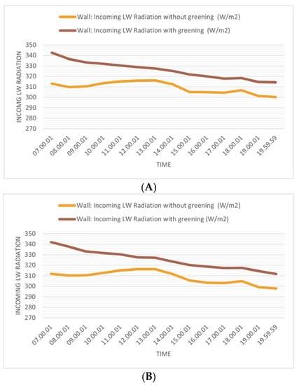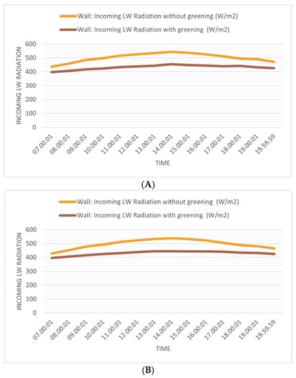 (A) Incoming LW radiation on the southeast façade on a cold day. (B) Incoming LW radiation on the northwest façade on a cold day.