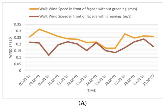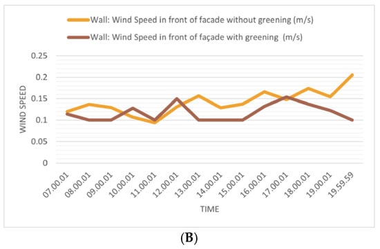 The LW in front of the southeast façade prevented the wind on a summer day. The highest wind speed blocking occurred at 9 a.m., with differences of 0.17 m/s; at 2 p.m., it was almost zero. The northwest façade covered with plants experienced different thermal behavior. There is no consistent pattern due to changes in the wind direction on the tested day. Most of the time, the LW was less successful at preventing the wind in this direction compared with the façade facing southeast (Figure 12).
