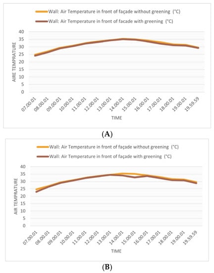 (A) Air temperature in front of the southeast façade on cold day. (B) Air temperature in front of the northwest façade on cold day.