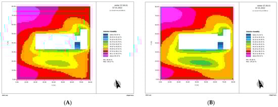 (A) Wind speed in front of southeast façade on a cold day. (B) Wind speed in front of northwest façade on a cold day.