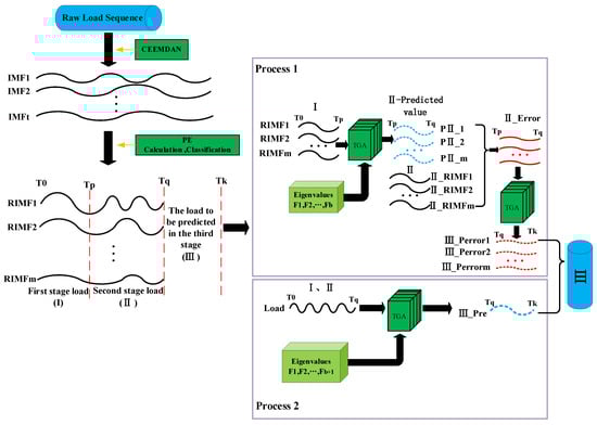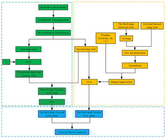 Figure 1 shows the proposed methodology of this paper. For short-term power load prediction, it is necessary to overcome the volatility of the load sequence and make full use of the historical load information. By employing appropriate algorithm models for prediction, better prediction results can be achieved. In order to address these challenges, this paper proposes a three-stage short-term power load prediction method based on the CEEMDAN-TGA algorithm.