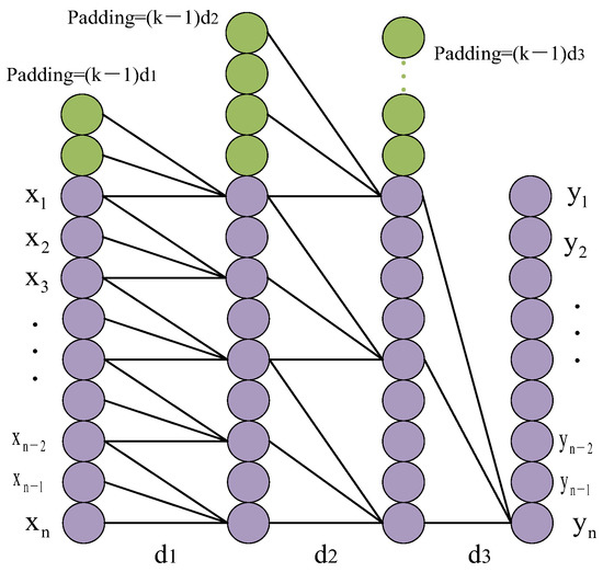 Equation (8) is used to calculate the dilation factor. Dilated convolution allows convolution to skip part of the input to achieve an expanded receptive field, and the range of convolution is controlled by the dilation factor, where the number of layers is represented by d, k is the kernel size, F is the filter with F = (f1, f2, …, fk), and X is the time series.