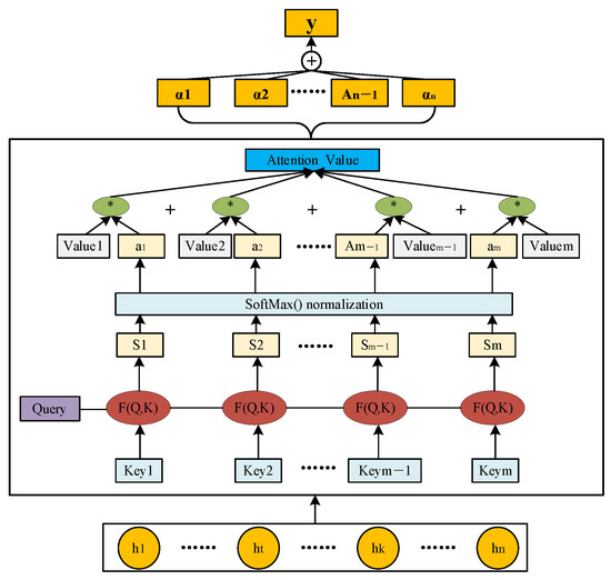 Figure 4 shows the principle of the attention mechanism. It can compute the contribution rate of the output data. The box part represents the calculation principle of the attention mechanism; h1, h2, …, hn are the input data of the attention mechanism, which are the output data of the GRU layer; α1, α2, …, αn are the allocated weight values of the data; and y is the final result.