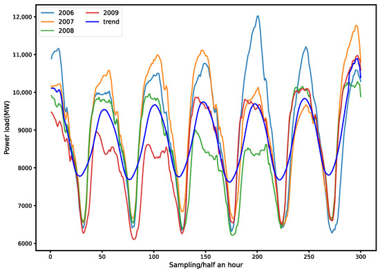 Time series generally consist of trends, seasonal variations, and residuals. A three-stage approach is employed in this paper to predict the error term in the third stage, making it approximate to the randomness or irregular fluctuations caused by accidental factors. Climate factors are used as feature values to approximate the impact of seasonal variations. Trend term extraction from historical load data in the same period can provide some trend guidance for the prediction model. The trend feature extraction of the historical load sequence is as follows: