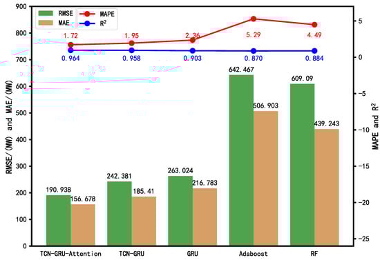 Figure 22. The evaluation metrics for the GRU, TCN-GRU, TGA models without error value and three-stage load prediction model based on CEEMDAN-TGA.