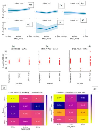 Figure 2a–f depicts E. coli levels from 2016 to 2021 for the normal (Neutral), El Niño, and La Niña periods. The levels of E. coli increased during the 2016 and 2017 El Niño periods and then dropped the following year in 2018, before rising again in 2020. In 2019 during La Niña and the normal period, the E. coli levels were centered in one place at 60 cfu/100 mL, while in 2021, no E. coli levels were detected from the La Niña, El Niño, and normal periods. Although the El Niño period had the highest E. coli count between 70 and 80 cfu/100 mL in 2016 and 2020, the E. coli levels in all periods from 2016–2020 exceeded 0 cfu/100 mL for effluent discharge quality limit. Figure 2g–i depicts the E. coli levels at each sampling location. The results show that during the La Niña period, the Matsulu and White River sites had similar E. coli concentration levels, which were higher than that of the Kanyamazane site. During the normal period, Matsulu displayed the highest E. coli count, followed by White River and Kanyamazane. However, the White River site had the greatest E. coli level during the El Niño period at 120 cfu/100 mL. According to the heat map (Figure 2j), the recorded concentration of E. coli (35.900 cfu/100 mL) was the lowest during El Niño in April when it was dry. In Autumn, during the El Niño period when it is wet, E. coli was still lower at 45.683 cfu/100 mL (Figure 2k). During La Niña, E. coli values showed no increase; they were clustered between 40 and 80 cfu/100 mL. Figure 2j shows that the highest count of E. coli (71.667 cfu/100 mL) was recorded in April during La Niña, while the lowest E. coli count (35.900 cfu/100 mL) was recorded in April during El Niño. The highest E. coli record may be attributed to high E. coli concentrations due to lack of dilution since April falls under the dry months in Mpumalanga province. For the White River site, it may also be attributed to the partial or inadequate treatment of wastewater from the White River WWTP. A similar pattern was reported by Maphanga et al. [40], stating that high levels of E. coli were recorded during the wet season. Moreover, the study correlated rainfall and E. coli, indicating that they have an inverse relationship (rainfall and E. coli). Furthermore, research was conducted by Abia et al. [41] in the Apies River, where contaminated water flows downstream before reaching an area of altered flow conditions (wider, flatter river channels and slower water velocity). These findings show that each phase of the ENSO influences the behavior of certain parameters such as E. coli.