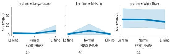The wet season was found to have greater suspended sediment parameters, and they were more dominant in the oxbow lake (Harun et al. 2014). The White River site displayed a similar reaction to the Lower Kinabatangan River catchment. The SS in this study were more dominant in the White River during the El Niño period. The rise of SS in the White River during the El Niño period may be attributed to surface runoff due to floods and the presence of clay, silt, sandy clay, and other particles or suspended material released as a result of structural damage caused by floods. In Florida, during El Niño or La Niña years, certain months can experience more precipitation than others, which would result in increased runoff and, in turn, increased SS load [49].