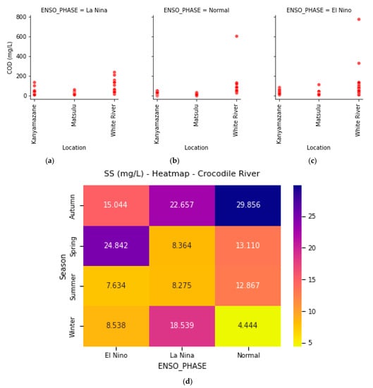The highest COD concentration was 134.000 mg/L in February during the normal period. The El Niño period showed the second-highest concentration in August at 106,583 mg/L. The lowest COD concentration was in January during the normal period at 20,222 mg/L. On average, the highest COD concentration was at 52,193 mg/L during the La Niña period, followed by a concentration of 46,423 mg/L during the normal period, and the smallest average concentration was recorded during the El Niño period at 44,566 mg/L. COD data showed a high standard deviation of 84.42 during El Niño period, 84.87 during the normal period and 77.40 during La Niña period. This indicates that values are generally far from the mean (see Appendix A). According to a study by Maphanga et al. [40], there is no spatial distribution of chemical oxygen demand in the Crocodile River, nor is there seasonal variation between sites. According to a study by Makuwa et al. [48] noted how COD may vary during the wet and dry seasons despite precipitation not predicting it. In contrast, Osuolale and Okoh [52] suggest that lower COD levels are primarily due to increased rainfall.