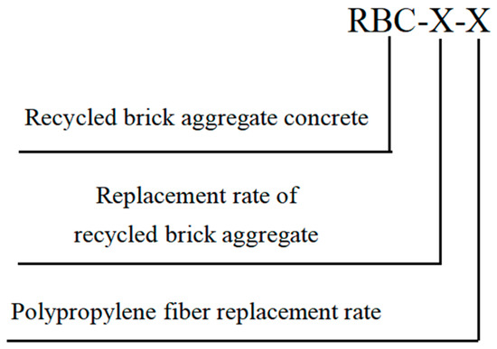 A total of 10 concrete mixture proportions were designed according to JGJ 55-2011 [50]. The concrete mixture slump requirements met the reference proportions. The concrete mixture proportions are shown in Table 6. The specimen numeration is illustrated in Figure 2. The strength of the concrete decreased significantly when the replacement rate of the recycled aggregates exceeded 50% [45,46]. Zheng et al. [11] found that PPFs provided the highest mechanical strength to concrete at a 25% replacement rate by adding PPFs to recycled concrete with different replacement rates. Zhang et al. [30] found that PPFs provided the highest mechanical strength to concrete at a 30% replacement rate. To make the RBA concrete with high strength, PPFs were selected to modify the concrete at a 30% replacement rate for this experiment.