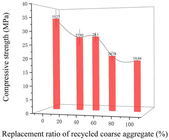 Figure 3 shows the compressive properties of recycled concrete with the RBA replacement rate. The results showed that the compressive strength decreased as the RBA replacement rate increased. The compressive strength was reduced by 21%, 20%, 41%, and 46% when the RBA replacement rate was 30%, 50%, 70%, and 100%, respectively. The reason was that RBA suffered secondary damage after being crushed by the jaw crusher, causing more microcracks inside them [59] and resulting in a less robust RBA than NCA. In addition, the compressive strength increased slightly when the specimens had a 50% RBA replacement rate. The reason for this was probably that the elastic modulus of the RBA was closer to that of the mortar, which could have reduced the stress concentration and made better use of the strength of the RBA when subjected to external loads [60,61].