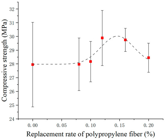 Figure 4 shows the compressive properties of recycled concrete with the PPF admixture when the RBA replacement rate was 30%. The compressive strength showed a trend of increasing and then decreasing with increasing PPF admixture content. Compared with recycled concrete without PPFs, the compressive strength was increased by 0.07%, 0.79%, 6.94%, 6.44%, and 1.79% when the PPF admixture was 0.08%, 0.10%, 0.12%, 0.16%, and 0.20%, respectively. Akid et al. [45] found that the compressive strength of NCA concrete was increased by up to 16% by PPFs. Zhang et al. [30] showed that the compressive strength of concrete with a 30% replacement rate was increased by up to 3.7% by PPFs. Das et al. [46] observed that the compressive strength of concrete with a 100% replacement rate was increased by up to 3% by PPFs. The compressive strength improvement of RBA recycled concrete provided by PPFs was slightly higher than that of recycled stone aggregate but much less than that of NCA concrete. The reason for the increased compressive strength was that the PPFs inside the recycled concrete could form a three-dimensional mesh structure [62], which could better prevent the generation of cracks and reduce the stress concentration and tip effect inside the recycled concrete. The reason for the decreased compressive strength was that the excessive PPFs were not uniformly dispersed, knotted, and caked during the mixing process, as described by Ref. [63], which led to an increase in the weak ITZ between the PPFs and the cement paste [64,65].