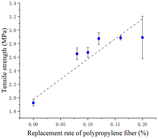 Figure 6 shows the tensile properties of recycled concrete for the PPF admixture. The tensile strength increased with an increasing PPF admixture content. Compared with recycled concrete without PPFs, the tensile strength of the recycled concrete was increased by 37.73%, 38.77%, 49.43%, 50.05%, and 50.26% when the amount of PPF admixture was 0.08%, 0.10%, 0.12%, 0.16%, and 0.20%, respectively. Das et al. [46] found that the tensile strength of NCA concrete was increased by up to 17% by PPFs. Zhang et al. [30] showed that the tensile strength of concrete with a 30% replacement rate was increased by up to 39.9% by PPFs. Ahmed et al. [38] observed a tensile strength of concrete with a 100% replacement rate was increased by up to 23% by PPFs. The tensile strength improvement of RBA concrete provided by PPFs was much higher than that of NCA concrete and recycled stone concrete. The significant increase in tensile strength may be explained by the fact that PPFs could strengthen the friction and mechanical bite between the coarse aggregate and the cement paste matrix and act as a “bridge” in the cracked cross-section [24,36].
