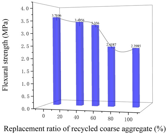 Figure 7 shows the flexural properties of recycled concrete with the RBA replacement ratio. The results showed that the flexural strength decreased with an increasing RBA replacement rate. The flexural strength was reduced by 6%, 10%, 34%, and 35% when the RBA replacement rate was 30%, 50%, 70%, and 100%, respectively. The reason may be that the RBA made from waste bricks had disadvantages, such as a high crushing index, high water absorption, and high porosity [17,18], which made the properties of RBA much weaker than those of NCA.