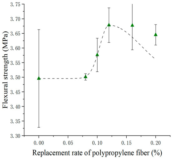 Figure 8 shows the flexural properties of recycled concrete with the PPF admixture. As with the case of compressive strength, the flexural strength increased and then decreased with an increasing PPF admixture. Compared with recycled concrete without PPFs, the flexural strength was increased by 0.15%, 2.3%, 5.22%, 5.19%, and 4.27% when the PPF admixture was 0.08%, 0.10%, 0.12%, 0.16%, and 0.20%, respectively. Yuan et al. [24] found that the flexural strength of NCA concrete was increased by up to 9% by PPFs. Zhang et al. [30] showed that the flexural strength of concrete with a 30% replacement rate was increased by up to 12% by PPFs. Das et al. [46] observed that the flexural strength of concrete with a 100% replacement rate was increased by up to 17% by PPFs. Compared with other aggregates, it had the lowest increase in the flexural strength of RBA concrete by PPFs. The reason for the increased flexural strength was that the appropriate amount of PPF admixture could better fill the pores, improve the pore structure, and make better use of the bridging effect of PPFs to redistribute the stress and reduce the stress concentration [67]. The reason for the decreased flexural strength was that the excessive PPFs required a large amount of cement paste to cover the fibers, which reduced the fluidity of the concrete mix and affected the denseness of the recycled concrete [68].