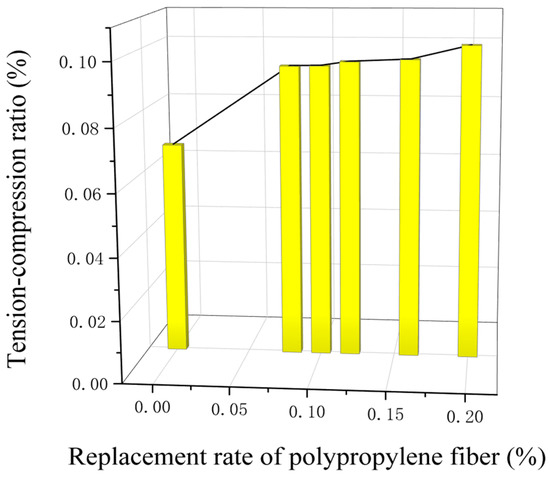 The tension–compression ratio refers to the ratio of tensile strength to the compressive strength of the concrete and is an important index to evaluate the brittleness of materials [63,69]. In this experiment, the tensile–compression ratio of recycled concrete with a 0.45 water–cement ratio and 19 mm PPF length is shown in Figure 9. Compared with recycled concrete without PPF, the tension–compression ratio of recycled concrete was increased by 37.65%, 37.79%, 39.83%, 40.99%, and 47.67% when the PPF admixture was 0.08%, 0.10%, 0.12%, 0.16%, and 0.20%, respectively. The reason for the increasing tension–compression ratio was that the admixture of PPFs reduced the brittleness and improved the deformability of the RBA concrete, resulting in the increase in tensile strength being much greater than the increase in compressive strength.