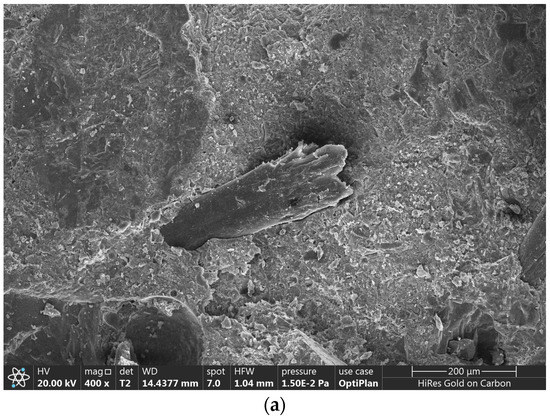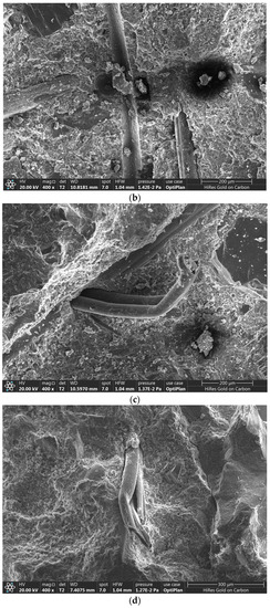 The SEM images of the specimens with different PPF admixtures are shown in Figure 10. The ITZ of the PPFs and the matrix was a weak link inside the concrete, and this is an important structure affecting the properties of the concrete [62]. Figure 10a shows that the ITZ of the PPFs and the matrix was tighter. These dispersed PPFs could effectively play a positive role, such as connecting the substrate and transferring the load. Figure 10b shows the crisscrossing and disorderly distribution of PPFs in the matrix, which eventually formed a three-dimensional distribution network within the concrete [34]. This structure could effectively reduce the stress concentration and the generation and development of cracks in the concrete, which had a positive impact on the macromechanical properties [64]. Figure 10c,d show that the PPFs agglomerated together, and the ITZ of the PPF and matrix was loosely bound. The agglomeration of PPFs led to an increase in the weak ITZ between the PPFs and the matrix, which negatively affected the macromechanical properties [65].