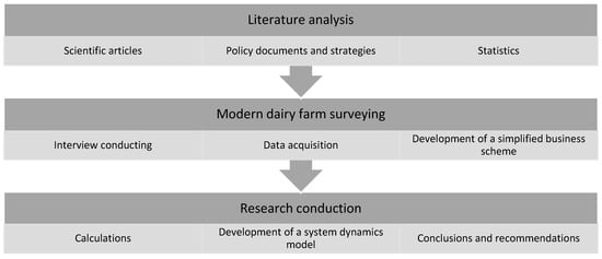To obtain all the necessary information, a literature analysis was carried out, in which scientific articles mainly from SCOPUS, ScienceDirect databases, Google, Google Scholar, and statistics and policy documents like European Commission reports and Latvia’s national plans, reports and strategies were analyzed. A combination of the following search requirements were used in the process of finding relevant information and articles: “Agriculture”, “Latvia”, “Europe”, “Climate neutral”, “Sustainable”, “Carbon farming”, “Green Deal”, “Greenhouse gas”, “Renewable”, “Strategy”, “Energy”, “Production”, “Efficiency”, “National Energy and Climate plan”, “Guidelines”, “Economic”, “Technical”, “Technology”, “Livestock”, “Dairy farming”, “Manure”, “Production”, “Policy”, “Innovation”, “Feed”, “Quality”, “Investment”, “Thermoregulation”, “Feed”, “Yield”, “Improvement”, “Management”, etc. Priority was given to the most recent articles and papers of relevance, scientific articles published in peer-reviewed journals in English. Then, one of the biggest and most modern dairy farms in Latvia was surveyed, which has already implemented several innovations for precise management, livestock welfare, modern technologies, and energy efficiency measures, while achieving a yield that significantly exceeds the average annual milking yield of a cow in Latvia and Europe. The farm owner was asked questions such as: Opinion on the Common Agricultural Policy, Carbon Farming and Support Mechanisms; Information about the company’s specifics, boundaries, affiliated companies, their cooperation, the importance of cooperatives, the impact of innovations on the company’s energy consumption, and the effectiveness of welfare implementation in relation to milking yield; the point of view of industry professionals on the biggest obstacles, as well as the experience of overcoming them; History of the company, its development, etc. These questions were mainly used to expand the research not only with the theoretical knowledge, but also with field professional knowledge who practically work in this field daily, while later connecting practical and theoretical knowledge by making calculations with data obtained from a real company to be able to draw the most objective conclusions and avoid any blind spots. Data were obtained from this farm and processed, such as data on energy consumption and milk yields by years, the introduced innovations and their specifics, the amount of manure produced and its processing, the amount of feed consumed, changes in number of cows and other related data; then, calculations were made. Subsequently, a system dynamics model using Latvia as a case study was made, which would not only provide an insight into the system’s structure, but also identify the system’s weak links and allow for the development of recommendations. The flow chart of the research development is shown in Figure 1.