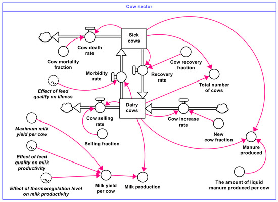Dairy cows are the most important element in a dairy farm, as the obtained raw milk is the main product that brings profit to the company. Dairy cows are mostly at least two years old and have reached their first lactation. The cow sector in the model consists of two main stocks: dairy cows and sick cows (Figure 3).