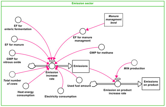The emission sector in the model represents emissions from the company, as well as emissions per unit of production. It is necessary to calculate the emissions to be able to evaluate the progress towards climate neutrality. In dairy farming, the main GHG emissions come from intestinal fermentation and manure management. Although in the documentation, the calculation of emissions from fuel consumption, electricity, and heat production is below the energy and transport sector, it is important to include it. In the model, the emission sector has two main stocks and two main flows (Figure 4).