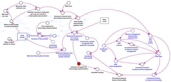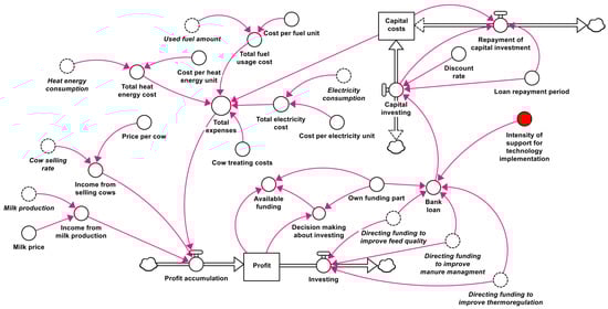 The system dynamics model was created based on the operating principles and data of one of the largest and most modern agricultural enterprises. Its main product is milk. There are about 470 dairy cows, and the average milk yield is 10,184 kg per cow per year, while the total milk production is 4736 tons per year. In total, there are three barns in the dairy complex where all the necessary animal welfare regulations and environmental requirements are observed. To execute the construction of cowsheds, the owner has implemented several projects of the European Agricultural Fund for Rural Development, which has enabled the introduction of innovations in the farm. This therefore increases the efficiency of farming, as well as provides the most suitable conditions for all ages of the livestock. Several projects were implemented, but the most important of them were: