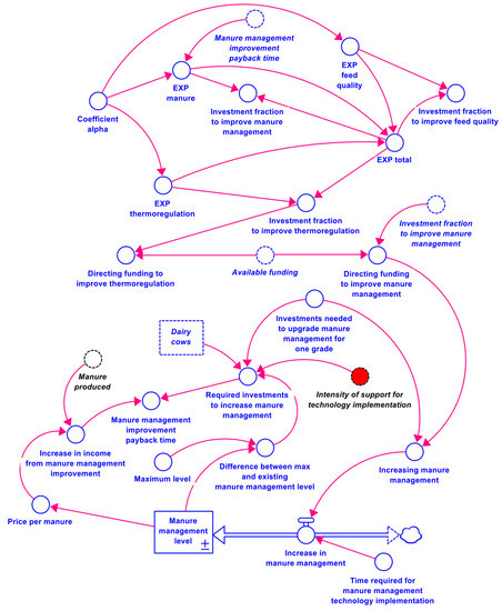 The model considers the time required to implement improvements at the management level (Figure 6). The improvement of the level is also influenced by the ratio between the funding diverted for improvement and the investment required to improve manure management by one point. The necessary investment for improvement per cow is determined by the necessary investment for raising the quality indicator by one point, the difference between the maximum and management level in the farm, as well as the available support measures. To determine whether it is worth investing in the improvement of manure management, the time implementation of improvement measures is determined by whether the improvement of manure management contributes to an increase in income. If the manure is used to produce biogas, it is possible for the dairy farmer to receive payment for the manure sold to the biogas plant, unless the farmer himself has invested in the biogas plant.