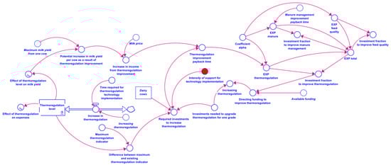 The main schemes were shown in a simplified way and included both thermoregulation and the impact of feed quality not only on yield, but also on animal health, which in turn affects mortality, expenses, product price, and thus competitiveness. The impact of support mechanisms and the amount of sold volume were also considered, which affects savings, and in turn later allows or prevents investments in new, modern technologies that would reduce expenses and increase energy efficiency, yield, and total income. Manure processing is also included as an integral part of animal husbandry. The impact of these processes on the generated emissions is also indicated, and the investments required to reduce them are included.