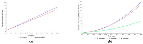 From the system dynamics model, it was determined that the generation of emissions in both the first and second scenario is characterized by a linear curve (Figure 9a). The number of generated emissions increases every year as the number of cows increases, which thus increases the number of emissions generated from intestinal fermentation processes. However, because of the introduction of innovations, it is possible to observe a reduction in emissions, as a higher level of manure management reduces emissions from manure.