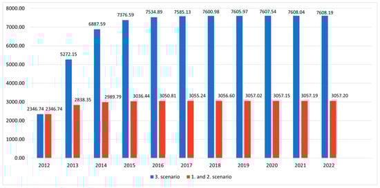 The initial milk yield per cow was 6.377 tons/cow, which remains unchanged in the first and second scenario, but in the third scenario, it is possible to observe an increase in milk yield in the maximum average milk yield per cow, which is 15.870 t/cow per year. Comparing the first year of the third scenario with the last one, it is possible to observe an increase of 69% (5261.45 t more), but comparing the third and first scenarios of 2022, it can be concluded that by investing in the improvement of the farm, it is possible to achieve a 60% higher amount of production, which is 4550.99 t more (Figure 10).