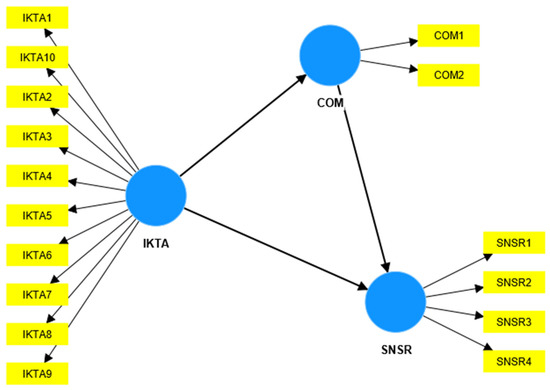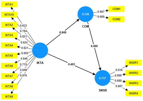The model in Figure 2 includes the outer loadings for each item because they are relevant to the constructs we introduced in the model. We notice that the impact of IKTA on COM is the highest (0.849), followed by the impact of COM on SNSR (0.490) and the impact of IKTA on SNSR (0.403). IKTA and COM contribute to 73.7% of the SNSR variance and IKTA to 73% of the COM variance.