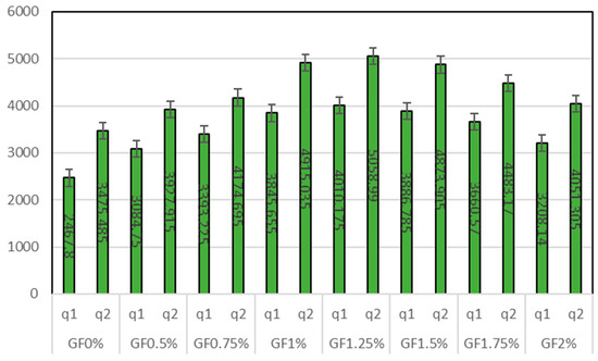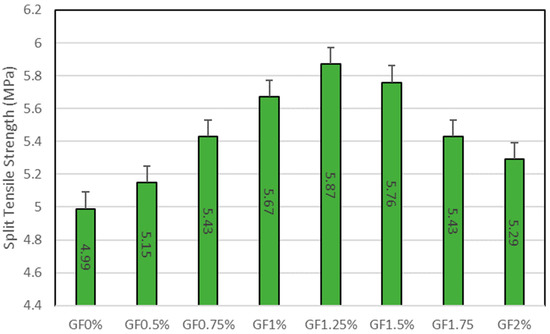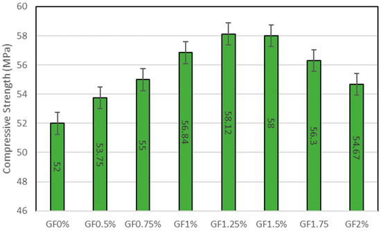 Figure 2 depicts GF’s compressive strength (CS) at different percentages. The experimental results indicate that the control mixture containing no GF exhibits a compressive strength of approximately 52 MPa. As GF is added to the concrete, it can be seen that strength increases to some extent. By adding 0.50% of GF, CS is enhanced by 3.36%. Further inclusion of GF of approximately 0.75% increases the strength by 5.76%. If the amount of GF is increased to 1%, CS is increased by 9.30% in contrast to the control mix, while blending the concrete with 1.25% of GF enhances the CS by 11.76%. Further inclusion of GF in concrete results in the depletion of CS. Adding 1.5% of GF increases the strength by 11.52%, less than GF1.25%. GF1.75% increases the strength by 8.26% by adding 1.75% of GF. GF2% has less strength than other proportions containing GF. In GF2%, including 2% of GF increases the strength by 5.13%. According to the study by Mastali et al. [39], 1.25% of GF in concrete is the optimal percentage for compressive strength, which is also supported by this investigation. It has been discovered that incorporating GF into concrete improves the material’s microstructure, thereby reducing the formation and size of microcracks. This ultimately increases the concrete’s density and compressive strength [40]. When GF is incorporated into concrete, its high energy absorption capacity dissolves energy during compressive deformation. The energy absorption property evidenced by GF increases the overall toughness of concrete, allowing it to withstand high compressive forces [41]. A study conducted by T. Thaker et al. [42] concluded that adding 1.2% of GF to concrete improves compressive strength by 21.2%.