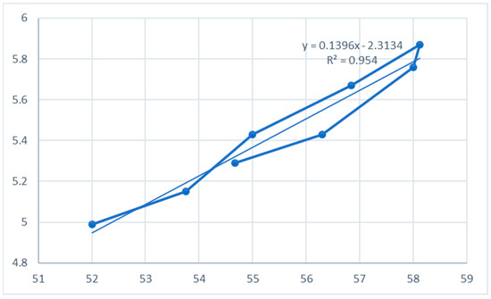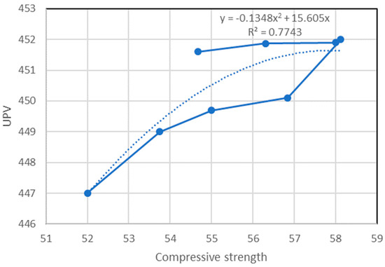 Figure 9 shows the correlation between the compressive strength of concrete and UPV. The value of R2 indicates that there is a solid relationship between both UPV and compressive strength. The equation in Figure 9 can be used to estimate the value of UPV or compressive strength if either of them is known. “X” in this equation represents the compressive strength, while “Y” is the value of UPV.