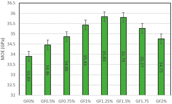 The modulus of elasticity of concrete was investigated as per ASTM C469 [37]; for calculation, the MoE Equation (1) was utilised. The findings on the modulus of elasticity of concrete with different proportions of GF are presented in Figure 6. It is indicated that incorporating GF into concrete yields a beneficial impact on the material’s MOE (modulus of elasticity). The MOE of the control sample containing zero per cent GF is approximately 33.89 GPa, while adding 0.50% GF to concrete boosts its strength by 1.66%. The MOE increases by 2.84% when 0.75% GF is added. Including 1% GF in GF1% increases the modulus of elasticity by 4.55%. The utmost increase in MOE that can be achieved by adding 1.25% GF is 5.72%. The incorporation of additional GF diminishes the MOE. Compared to GF1.25%, GF at 1.5% increases the MOE by 5.61%. GF1.75% has an MOE that is 14.05% points higher than the control sample, while GF2% has an MOE of 2.53% points; thus, introducing more GF than 1.25% reduces the MOE. The GF has high rigidity because it can resist deformation [43], which increases the MOE of concrete. An excessive amount of GF in concrete lessens the MOE due to the formation of clusters that reduces the workability and cohesiveness of concrete. At high concentrations of GF of more than 1.25%, the increased abundance of fibres can potentially disrupt the concrete matrix’s internal structure. This disturbance can produce fissures, micro-cracks, or interfacial defects, compromising the structural integrity of the composite material and lowering its modulus of elasticity.