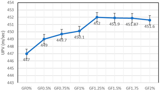 We employed a non-destructive test to examine the concrete’s quality, durability, and integrity. Ultrasonic pulse travel time measurement is a technique that can assist in identifying areas within concrete structures that exhibit reduced strength, cracking, or delamination. Figure 8 depicts the UPV of mixes with varying amounts of glass fibre. The value of UPV is between 447 m/s and 452 m/s. The control mix has the lowest UPV of 447 m/s, whereas GF0.5% with 0.50% of GF has a UPV value of 449 m/s. Further addition of GF content results in an increase in UPV, which shows that the addition of GF also increases the UPV to an optimum percentage. Beyond that, UPV starts to decline. It can be seen that GF1.25% has the maximum UPV of 452 m/s, which is approximately 1.11% more than the control mix; adding more GF beyond 1.25% results in a reduction in UPV, which shows that 1.25% is the optimum percentage to be used in concrete for better durability, better integrity, and fewer defects. A study carried out by Sandeep L. Hake et al. [45] shows that all the mixes containing various proportions of GF exhibit superior UPV, which shows that it improves the quality of concrete and concrete exhibits higher velocity due to its density, homogeneity, and uniformity in comparison to other materials. The inclusion of GF improves the UPV, which may be because of the enhanced bonding between the GF, cement matrix, and aggregate particles. GF has a high density as it is added to concrete. It also increases the overall density of concrete, which UPV increases. UPV starts declining after some extent due to fibre clustering in concrete and inadequate bonding between cementitious materials, the aggregate, and GF.