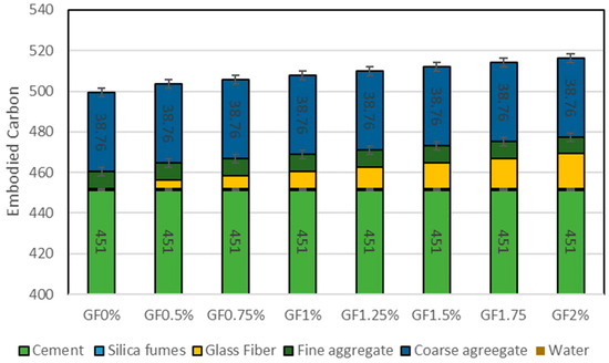The calculation of embodied carbon for each substantial proportion containing different percentages of GF has been conducted through a comprehensive literature review. The embodied carbon factor for each material was taken from the available literature review, as shown in Table 4.