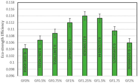Concrete cannot be selected only because its low embodied carbon is more sustainable, so the selection of concrete’s eco-strength efficiency should be considered. Eco-strength efficiency (ESE) is the evaluation of the environmental sustainability of concrete based on the proportion of its mechanical strength to its embodied carbon footprint. This research seeks to evaluate the effectiveness of concrete in terms of its mechanical performance while minimising its environmental impact. This study computed the ESE (Effective Stress Exerted) values for various concrete formulations containing variable amounts of glass fibre. Eco-strength efficiency is the ratio of CS (compressive strength) and EC (embodied carbon) of concrete. The compressive strength of concrete is considered to calculate the eco-strength efficiency as it is the principal mechanical property of concrete that is considered while selecting the concrete. Figure 11 shows the eco-strength efficiency (ESE) of concrete, and it can be seen that the control mix has the lowermost ESE of approximately 0.104 MPa/kgCO2·m3. Eco-strength efficiency increases with increases in GF up to 1.25% of GF inclusion, which has the maximum eco-strength efficiency. GF1.25% has 9.44% more ESE than the control sample. As the content of GF rises more than 1.25%, ESE decreases. GF1.5% with 1.5% of fibre inclusion has an ESE 8.77% higher than the control mix, and GF 1.75% increases the ESE by 5.14%. Blending concrete with 2% fibre increases the ESE by 1.68%. GF1.25% is recommended as it has the highest ESE among all the mixtures.