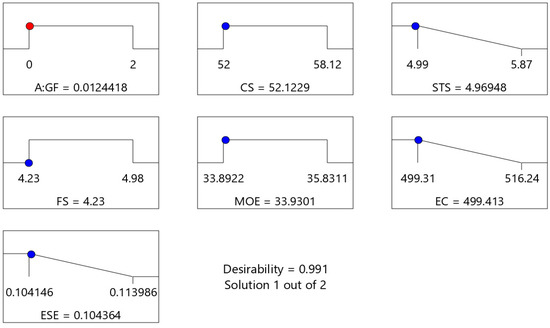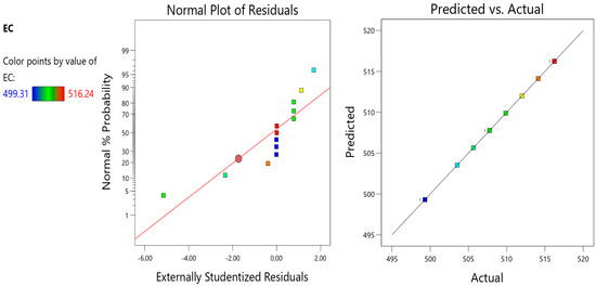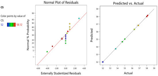 Table 6 displays a statistical evaluation of the model’s dependability and reliability. Various metrics can be employed to assess the trustworthiness of a model, such as the standard deviation and R2 values [58,59,60,61,62]. The term R2 is commonly called the coefficient of determination in the academic literature [23,63]. The R-squared value, denoted as R2, measures the level of agreement between the data and the model generated through the utilisation of response surface methodology (RSM) [61,64]. The value of R2 varies from 0–100% [22,29]. The greater the value of the R2 model, the higher the accurate [54,55]. For all the developed models in this investigation, it can be seen in the table that the value of R2 is near 0.9, which means that all the developed models have very high accuracy. The value of R2 for each response, including CS, STS, FS, MoE, UPV, EC, and ESE, is 0.9999, 0.9991, 0.9398, 0.9999, 0.9601, 0.9999, and 0.9999, respectively. Furthermore, the adequate precision for each response should be more than 4; the more critical the accurate precision, the more accurate the model will be. It can be seen that adequate accuracy for every response is more than 4; it also displays the reliability of models. The adequate precision for CS, STS, FS, MoE, UPV, EC, and ESE is 605.4968, 87.5383, 19.1229, 540.5094, 24.1984, 16,367.6796, and 471.9818.