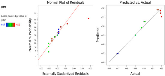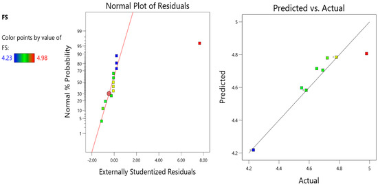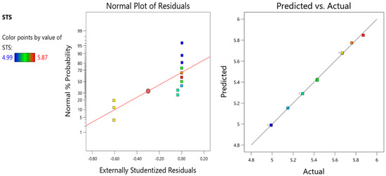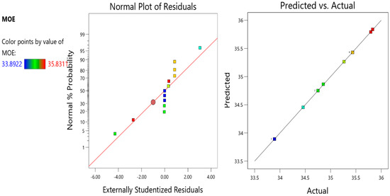 Equations (2)–(8) can be used to predict the properties of concrete with varying amounts of GF. “A” in the equation represents the GF as an input variable. Using the factor-coded equation, estimating the response for predetermined values of each component is feasible. It is common practice to assign a matter of one plus to high levels of a factor and a value of one minus to low levels of the same component [65]. Using an encoded equation confers advantages in determining the relative impact of the components through the evaluation of the factor coefficients. We followed the procedures outlined previously to accomplish this. Figure 12, Figure 13, Figure 14, Figure 15, Figure 16, Figure 17 and Figure 18 present the predicted and actual models with normal plots of residuals for each response.