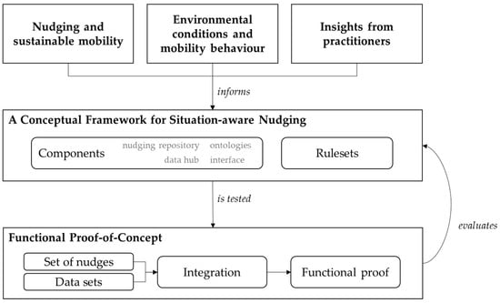 To develop a framework for situation-aware nudging towards sustainable mobility, we draw from several domains, which are seldom linked in the academic discourse, and link them on conceptual and technical levels. Besides academic challenges, which become evident from the literature, we anticipate the urgent need for supportive tools in the ongoing mobility transition from stakeholders in the public sector. Thus, we conducted focus groups, which informed the conceptual and technical design of the proposed framework. All three sources are integrated and inform the conceptual design of the proposed framework for situation-aware nudging (see Figure 1).