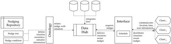 The proposed framework is set up of four components. The nudging repository, the data hub, ontologies that link the latter two, and the interface that manages client communication. This architecture facilitates great flexibility and can account for the dynamic nature of situations. The nudging repository and the data hub can be extended or adapted as needed without a necessary redesign of the entire system. Changes must then be updated in the ontologies and, in case, in the interface.
