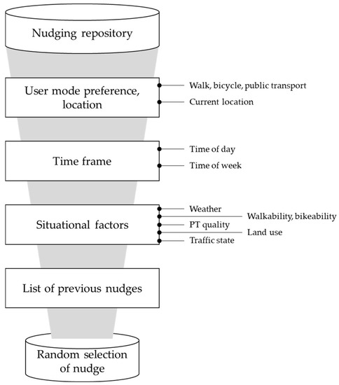 To return relevant, situation-aware nudges, a set of rules processes the attributes of the end user, which are conveyed as part of the request to the data hub (see Figure 3). Depending on mode preferences and location information, nudges from the repository are filtered. In addition, rules linked to the schedule, which is part of the interface, define the frequency of nudging, the maximum number of nudges per day, and time frames for certain nudges. These rules are adaptable and can thus be optimized for different user groups or intervention goals. Another layer of rules is linked to the nudge ontologies. These rules are defined as queries for the data hub, in which thresholds are used for reflecting situational factors. Again, these rules can be adapted according to the perception of situations in targeted user groups. The perception of “moderate temperature”, for instance, differs significantly between regions [32]. The same holds true for the traffic state [33], the distance to public transport stops [34], and other situational factors that are perceived and rated by citizens. Applying these layered rulesets leads to a subset of situation-aware nudges from which nudges are randomly selected and delivered to the client.