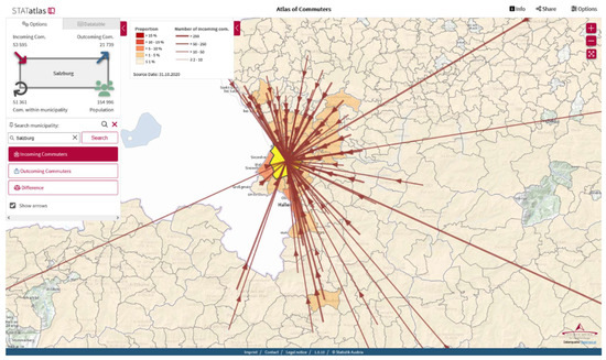 Screenshot from the Atlas of Commuters [35], showing incoming commuters to the city of Salzburg.