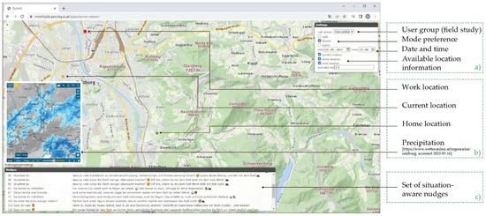 Monitor for the functional proof-of-concept in the context of a field study. Settings for different users can be reproduced in the settings (a). Situation awareness is derived from location information, such as the weather at a particular location (b). From the set of situation-aware nudges, nudges are randomly selected and delivered (c).