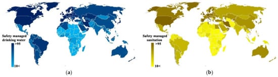 Percentage of people with access to safely managed (a) drinking water facilities and (b) sanitation facilities.