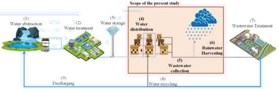 Urban water infrastructure (UWI) comprises three primary systems, i.e., water supply systems (WSS), urban drainage/stormwater systems (UDS) and wastewater systems (WWS). These components are essential for delivering clean water to customers and collecting surface runoff from urban areas and sanitary sewage from households in cities. While providing these essential services, these systems also offer opportunities to implement strategies that can enhance urban resilience. However, these systems face various challenges and stresses that can result in technical failures or performance losses, leading to exorbitant costs [1]. Some of these challenges include ageing infrastructure and insufficient investment in infrastructure rehabilitation, which can reduce system capacity, population growth and rapid urbanisation that increase system loads, inadequate water infrastructure maintenance, climate change and extreme weather events such as flooding and drought. Addressing these challenges is crucial for maintaining the functionality of UWI and avoiding costly disruptions [2].