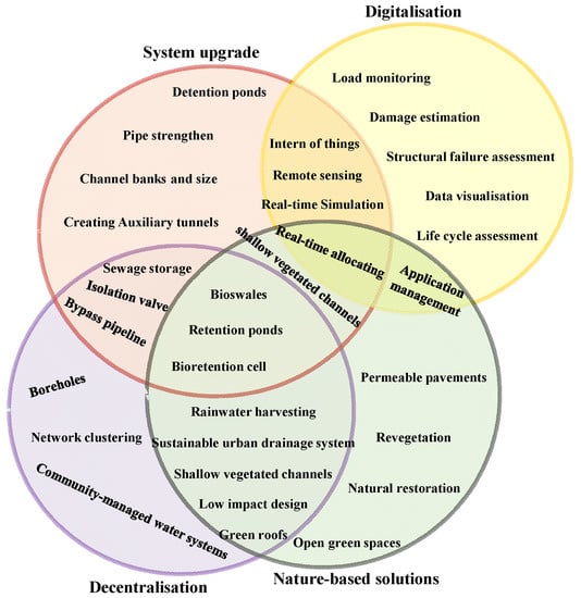 Figure 5 depicts the four main strategies proposed to improve UWI resilience. These strategies include the following: (1) system upgrade involving a wide range of installation and configuration, improving and constructing the physical infrastructure of the UWI, such as pipe strengthening, increasing channel banks, creating auxiliary tunnels or constructing detention ponds; (2) decentralisation where possible by introducing small-scale water related facilities or community-managed water system;, (3) nature-based solutions (NBS) integrating natural elements, such as wetlands or open green spaces into the urban water system; and (4) smart network using digital technologies, such as sensors, computational devices and big data analytics to improve the monitoring, control and management of UWI.