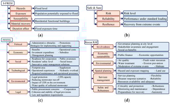 Different aspects and indicators used for various holistic frameworks used for resilience assessment of UWI: (a) S-FRESI, (b) Safe & Sure, (c) PESTEL, (d) RAF.