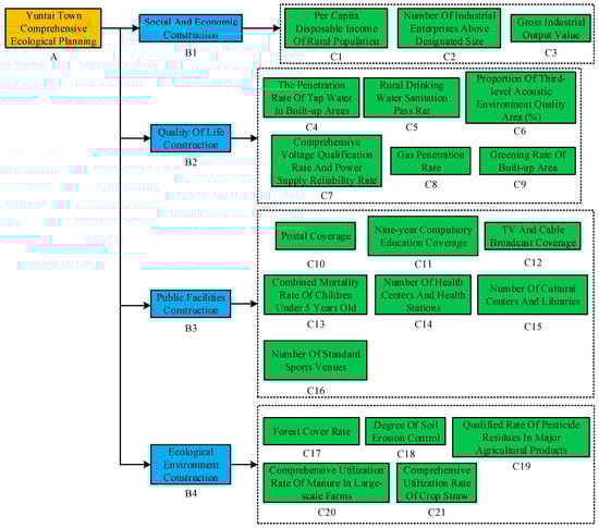 According to Table 1, a comprehensive ecological planning evaluation model for Yuntai Town was established, which is divided into target layer (A), criterion layer (B), and indicator layer (C). The target layer is the comprehensive ecological planning of Yuntai Town. The criterion layer includes socio-economic development, quality of life development, public facility development, and ecological environment development. There are a total of 21 indicators in the indicator layer, as shown in Figure 1.