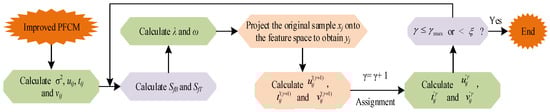 In Equation (11), is the cluster center vector of class . The combination of FLDA and fuzzy clustering algorithm can improve its clustering accuracy [34]. After combining FLDA with improved PFCM, the following parameters’ calculation methods can be obtained. Wherein, Equation (12) is the calculation of cluster center matrix .